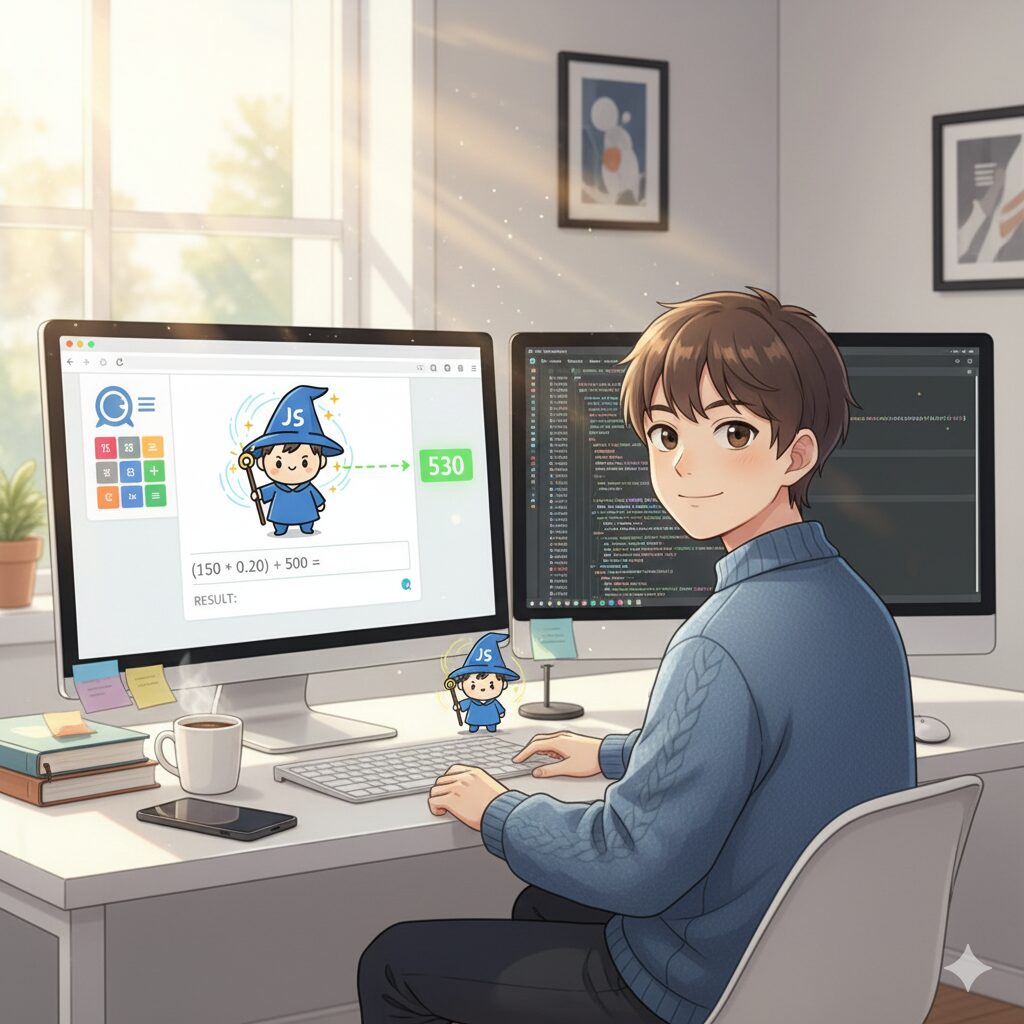 👉 JavaScriptは +、-、*、/、%(あまり)を使って計算できます。