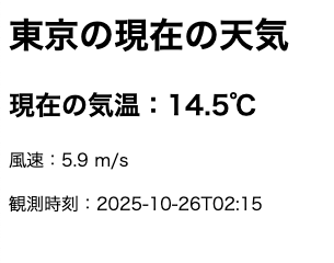 これがサーバーからもってきた情報か〜。天気APIってなんで無料で使えるの?