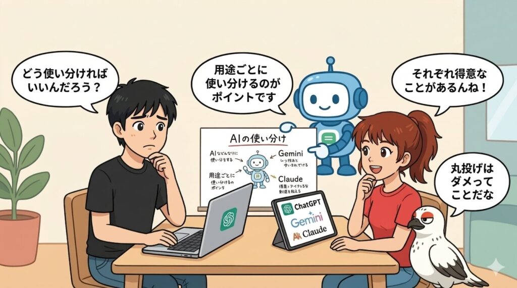 それぞれ得意分野はありますが、「最終判断は自分で行う」ことが大切です。AIはあくまでサポート役として使いましょう。