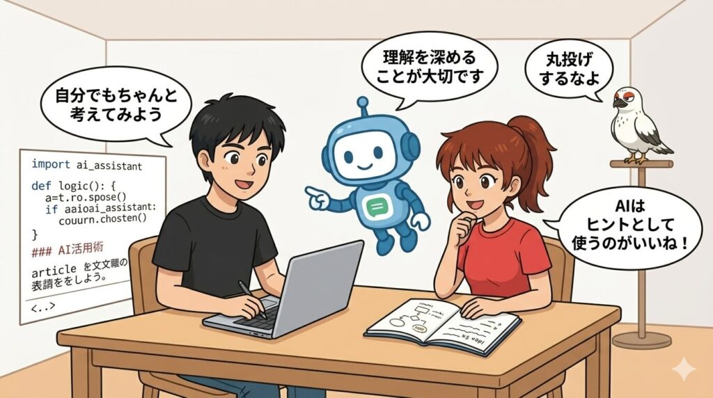 なるほどね〜。AIに助けてもらいながら、自分でもちゃんと考えるのが大事ってことか😊