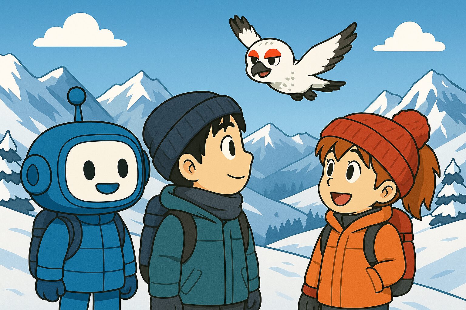 冬山で講義をAI先生の受けるあるく、ミナ、ライ太