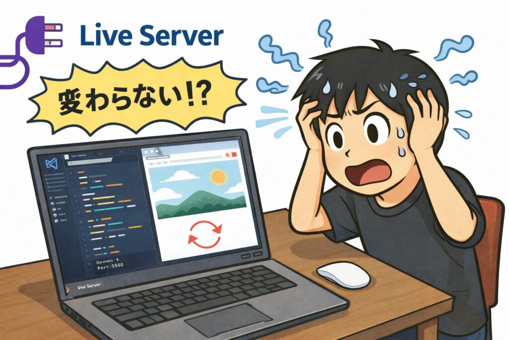 いいところに気づきましたね。「Live Server」あるあるです。HTMLとCSSが反映されないときは、だいたい次のどれかが原因です。上から順に確認してみましょう👇
