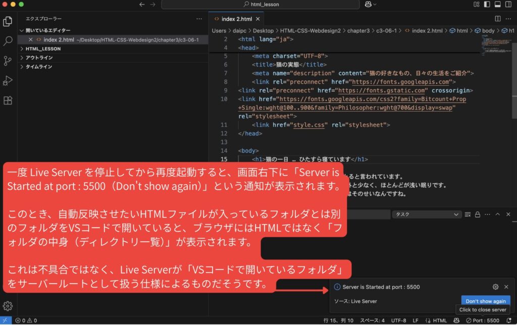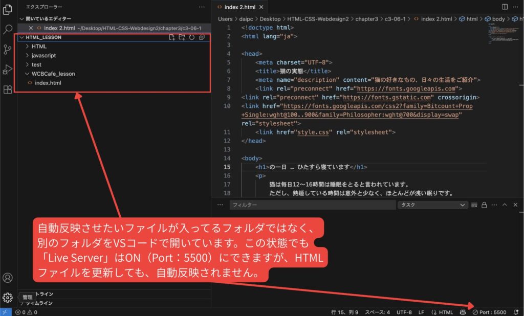 けれど、VS Codeが「このフォルダ全体を監視する」状態になっていないため、CSSやHTMLの変更を検知できず、自動反映されません。