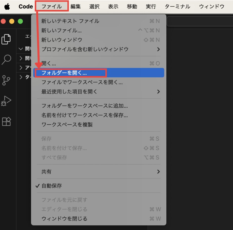 1️⃣ 編集したいファイルが入っているフォルダを、VS Codeの「ファイル」→「フォルダーを開く」で開く