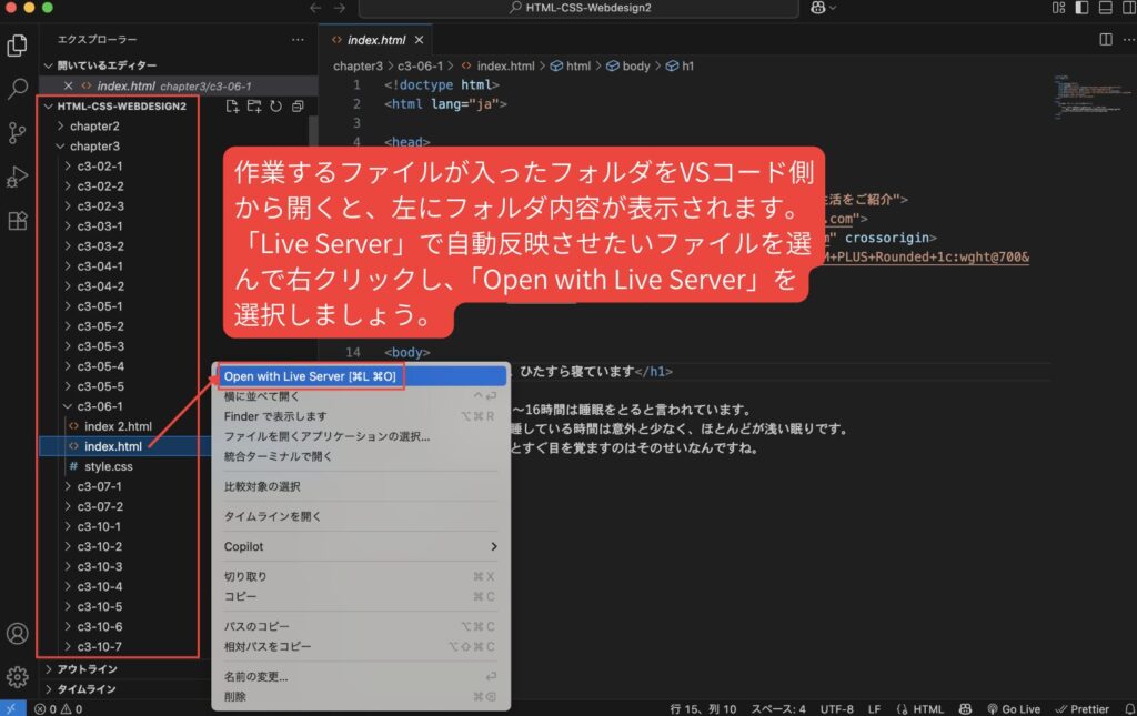 2️⃣ VSコードで編集したいHTMLファイルを右クリック → 【 Open with Live Server 】を選択して、Live Serverを起動する
