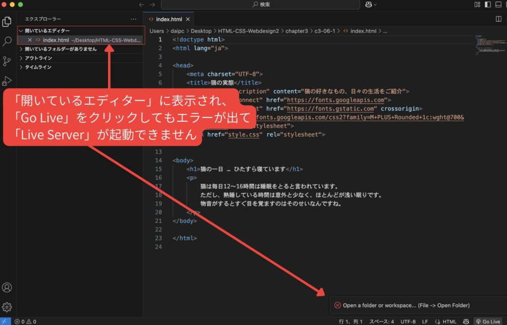 いろいろ調べて原因を切り分けた結果、「そもそもVSコードでのファイルの開き方が間違っていた」という、初心者あるあるな落とし穴だったので、同じところで詰まる人向けにまとめておきます(画面の見方については、前回の「その1」をご参照ください🙏)
