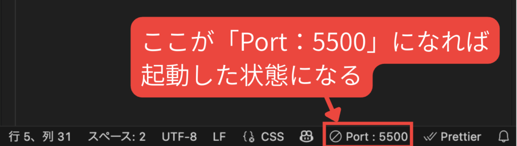 「Live Server」を起動するには、ステータスバー右下にある「Go Live」をクリックします。デフォルトではONの状態になっていないので、ここをクリックして起動させましょう。