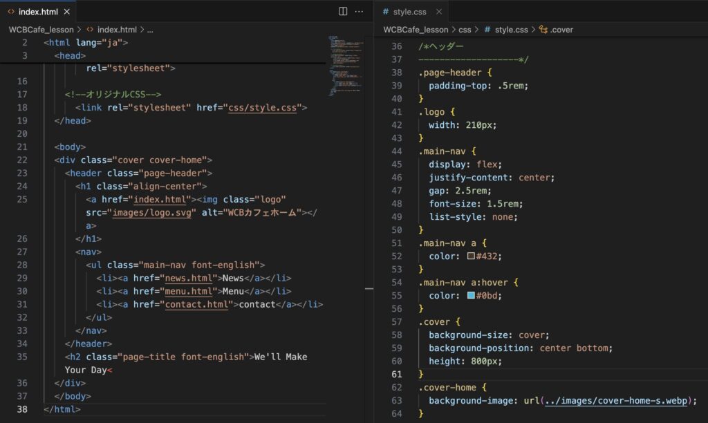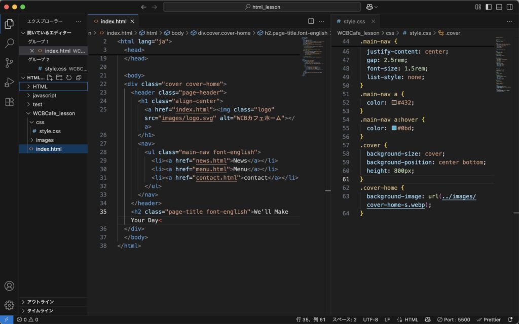 ※ VS Codeのコードの色は、選んでいるテーマ(見た目設定)によって多少変わることがあります。